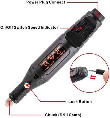 Inklusive tillbehör: Smidig liten elektrisk nagelfil som kommer inklusive 6 bitsar och 6 sandpapper. Särskilt lämpligt för akryl-nagelkonst, men även utmärkt för annan manikyr och pedikyr.