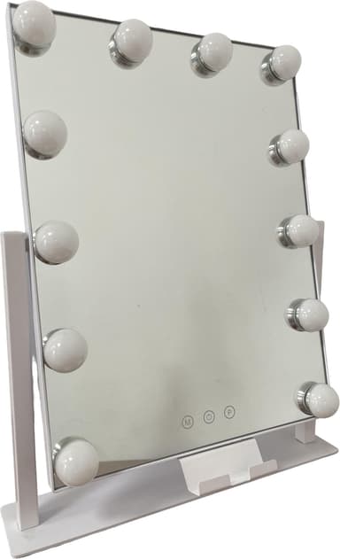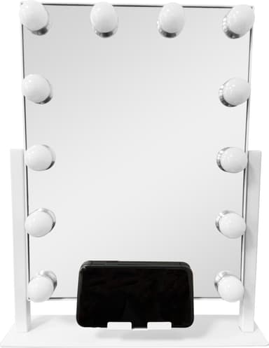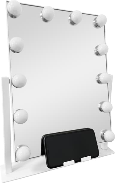 A Home Hollywood-spegel A100026 har 12 LED-lampor och en mobilhållare på framsidan. Den står på ett bord och erbjuder justerbar ljusstyrka och färginställningar. Den drivs av den medföljande USB-C-kabeln och stängs av automatiskt efter 60 minuter.Läs mer om produkten
