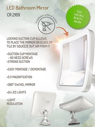 Finns det inte tillräckligt med ljus i ditt badrum blir den dagliga vården svår. Har du fått intryck av att den aktuella spegeln är otillräcklig och inte uppfyller sin funktion? Eller du kanske letar efter ett intressant och originalt sätt att förbättra funktionaliteten i utrymmet ovanför handfat? Camry badrumsspegel kommer att lösa alla dessa problem! Den praktiska LED-spegeln är det perfekta hjälpmedlet för exakt rakning och perfekt smink, tack vare LED-bakgrundsbelysning och 5x förstoring. Spegeln är lätt att montera och fästs med en sugpropp. Den är enkel att ta med på en resa. Produkten drivs med batterier (3 st. AA)
