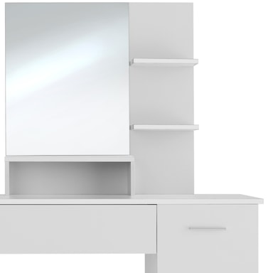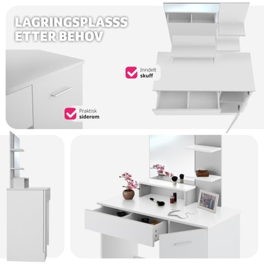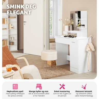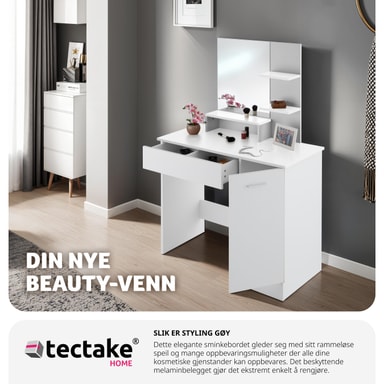 Sminkbordet Zoe från Tectake gör styling till ett rent nöje. Med den stora spegeln kan du skapa perfekta sminkningar och frisyrer. Den robusta spånskivkonstruktionen är belagd med melamin, vilket ger en reptålig och lättskött yta. Den enkla och raka designen gör att sminkbordet Zoe passar in i alla miljöer och skapar en stilren siluett i vilket rum som helst.