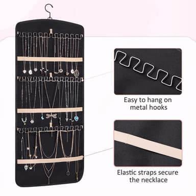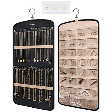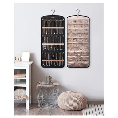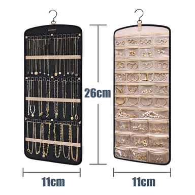 Dubbelsidig hängande design: Smyckesförvaringen har gott om utrymme för alla dina accessoarer. Den är designad med många genomskinliga fickor för att hålla ringar, örhängen, armband, klockor och hårspännen organiserade och gör det lätt att hitta vad du söker. Den andra sidan är designad för förvaring av dina halsband.