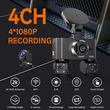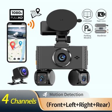W3 WiFi 4-kanals dashcam 2K Nattseende Fyrdubbellinsbil DVR Fordonskörningsinspelare med GPS-modul + Step-Down-kabel【Fyrkanalsinspelning】Fånga omfattande bilder med främre kamera och bakre, vänstra och högra kameror för fullständig täckning.【AvanceraLäs mer om produkten