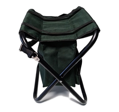 Lättvikts hopfällbar pall Merganser med canvas sits och integrerad väska. Väskan har två fickor och en justerbar rem och bärremmar.