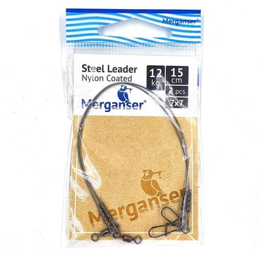 Merganser Steel Leader, 7x7 nylonbelagd + rullande svivel och snygg knäppning