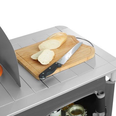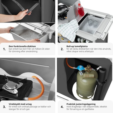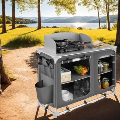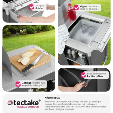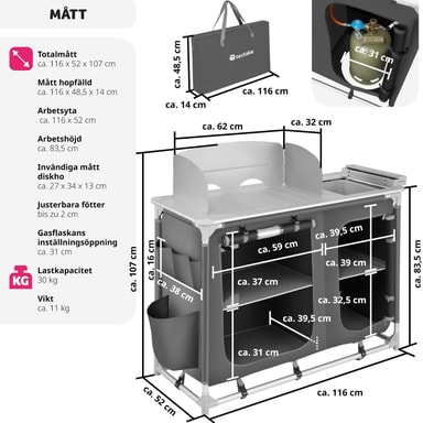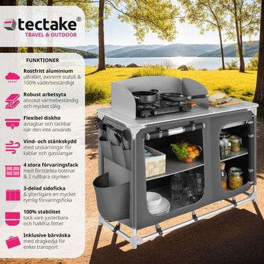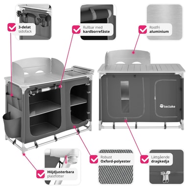 Detta campingkök blir den perfekta följeslagaren på din fritid, antingen på camping eller i ditt hem. Detta campingkök har en bänkskiva med ett praktiskt vindskydd och en diskho som kan täckas över. För god ventilation är de två rymliga förvaringsutrymmena på baksidan delvis utrustade med nät. Den robusta aluminiumramen och de höjdjusterbara fötterna på ger hög stabilitet. Nedmonterat kan detta lätta kök enkelt transporteras i den medföljande bärväskan. Detta funktionella campingkök är perfekt när du är på resande fot.