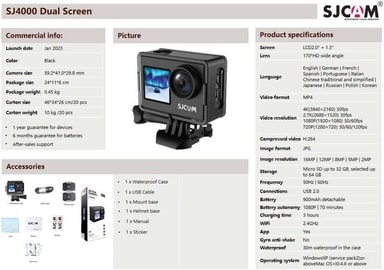 Kameran har både en skärm på framsidan och en 2"" touchskärm på baksidan. Den har stöd för upp till 4k videoupplösning och kan ta foton i upp till 16MP. Kameran har en 170 graders FOV och med hjälp av det vattentäta skalet så kan den användas i djup upp till 30m.