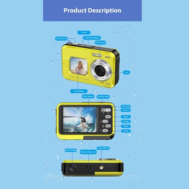 3,5 m/11FT undervattenskamera: Den vattentäta designen gör att denna undervattenskamera kan dyka 3,5 m (11 ft) ner under vatten - perfekt för snorkling, vattenparker eller andra vattenäventyr, inklusive simning, drifting, surfing, strand och bad (Obs: Se till att batteriluckan är väl låst innan du tar kameran under vattnet.)
