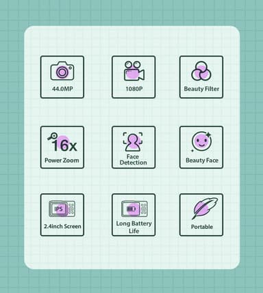 Smart ansiktsigenkänning och leendeigenkänning: Kamerans avancerade funktioner identifierar och fångar automatiskt leende ansikten och upptäcker mänskliga ansikten vid fotografering. Den har även skönhetsfilter och anti-shake-stabilisering.