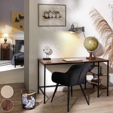 Skapa en solid grund för produktivt arbete med vårt rustika skrivbord Donegal från tectake. Bärbar dator, filer, dokument och andra kontorsredskap har gott om plats på den stora bordsytan, och de två sidfacken erbjuder extra förvaringsutrymme. Den svarta färgen på den pulverlackerade stålramen sticker ut från trädekoren på ytorna, vilket skapar den typiska materialblandningen för det industriella utseendet. Utmärkt benutrymme, ett säkert stativ på sex justerbara plastfötter och en hög lastkapacitet avrundar egenskaperna hos detta lättskötta skrivbord och understryker dess robusta karaktär.