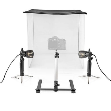Fotostudion är lätt att ta med sig och kan förvaras i transportväskan. På ett par sekunder är studion redo för fotografering. Ljusstyrkan kan justeras genom att stativet placeras närmare eller längre bort från studion. Ett stativ för montering av kamera och flera bakgrundsdukar i olika färger ingår.