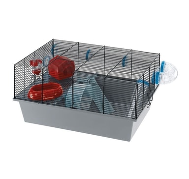 Milos Large är buren för möss, även lämplig för hamstrar, gjord av solid metalltrådsnät med plastbas. Tack vare det speciella tätt stickade trådnätet tillåter den att ta hem små gnagare i total säkerhet. Livsmiljön Milos Large är komplett med användbara tillbehör som hylla, stege, bo och hjul, samt genomskinliga rör designade för ditt djurs stora njutning. Praktisk och lätt att rengöra, den är utrustad med en hög bas som förhindrar att skräp spills utanför buren för en alltid städad och ren miljö.