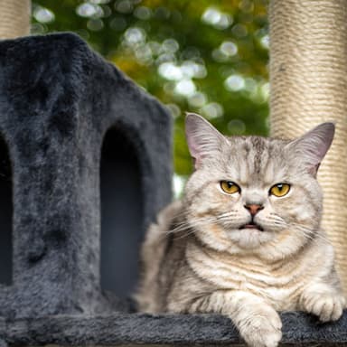 Extras inkluderar en mysig och bekväm lya, en supermjuk plyschbubbla att leka med och två utsiktsplattformar för att hålla ett öga på allt. Allt detta är fördelat på tre nivåer med klösmöjligheter för klövvård.