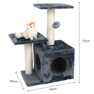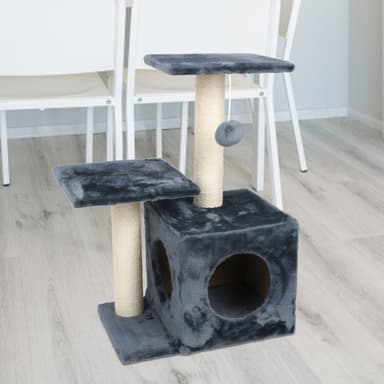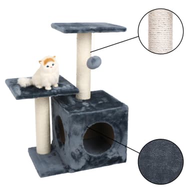 Klätterträdet är utrymmesbesparande och robust byggt så att det passar in i alla bostadsutrymmen. Det finns klösmöjligheter på två nivåer, samt olika tillbehör som en grotta, plysch pom poms och utsiktsplattformar, så att din katt aldrig kommer att bli uttråkad.