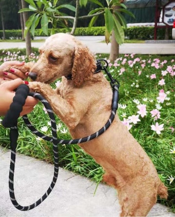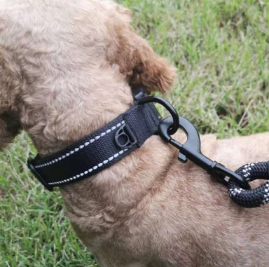 Premiummaterial: Kragen är tillverkad av mjukt och elastiskt nylonmaterial och säkerställer komfort för ditt husdjurs hals. Den innehåller två reflekterande trådar för ökad synlighet under svagt ljus. Nylonbandsfogar är alla behandlade med sömnad för att skydda dina hundar och händerna är inte lätta att repa under användning.
