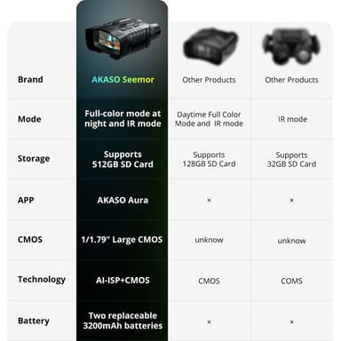 Se tydligt i mörker med AKASO Seemor: 4K färg eller IR-nattsyn, AI‑ISP, 16× zoom, 3″ skärm och Wi‑Fi. Inkluderar dubbla batterier och tillbehör – räckvidd upp till 500m.Läs mer om produkten
