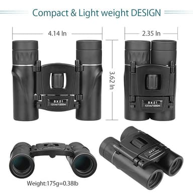 Högkvalitativ optik: Denna kikare är byggd med slitstark ABS och optiskt glas och erbjuder ett 8x21 förstoringssystem med en 21 mm objektivlins. Takprismadesignen levererar ljusa, tydliga bilder med minimal distorsion.