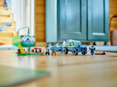 Setet LEGO City Polisens mobila hundträning innehåller en SUV, släp, 3 träningsaktiviteter, 2 minifigurer och 2 hundfigurer, däribland en valp.Läs mer om produkten
