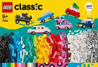 Bygg- och leksetet LEGO Classic Kreativa fordon innehåller en polisbil, en glassbil, en fyrhjuling, en frontlastare, en lastbil, en limousin, ett terrängfordon och en kombi.Läs mer om produkten