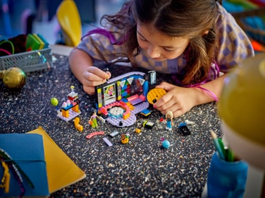 Ett lekset med karaoke för barn, med en roterande scen, festtillbehör, 2 LEGO Friends karaktärer och en geckofigur.Läs mer om produkten