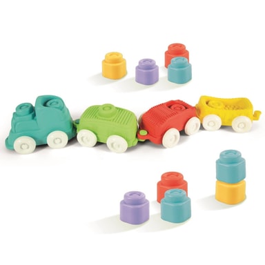 Alla delarna i setet är mjuka och har olika texturer som barnen kan känna på och utforska. Barnen kan bygga om tåget som dem vill och stapla klossarna på varandra, eller på tåget. Här är det bara fantasin som sätter stopp.