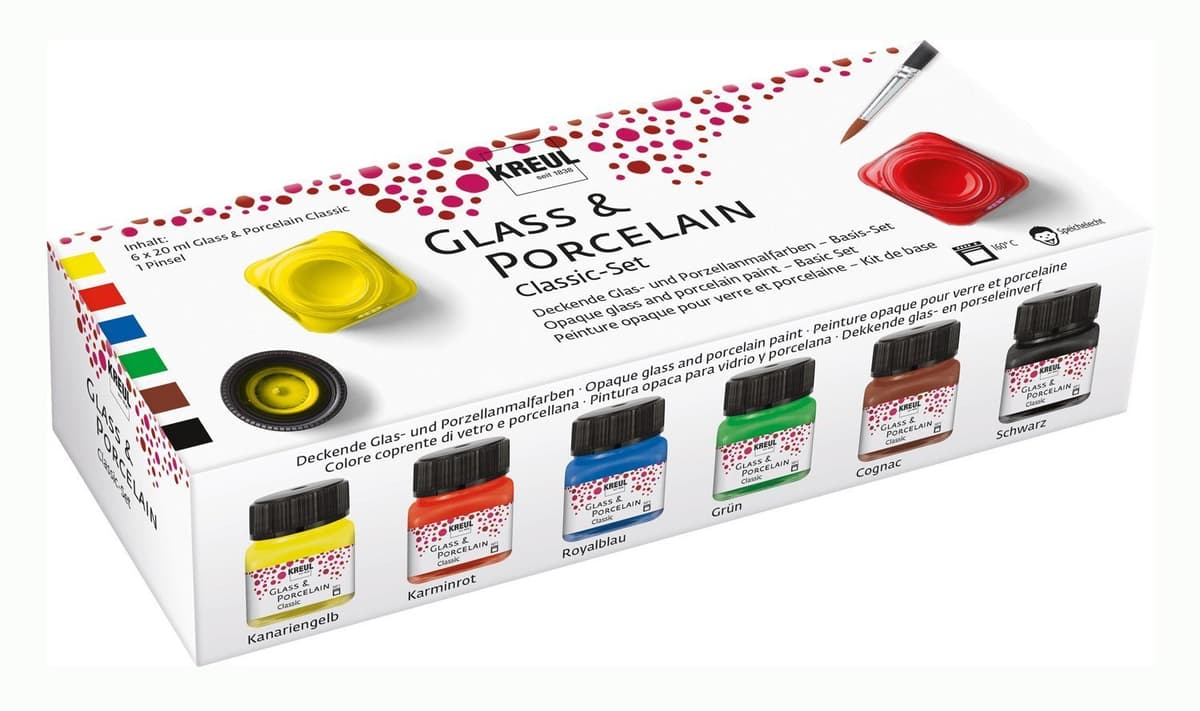 Set om 6 x 20 ml och en borste.För dekor av glas, fönster, porslin, terrakotta, metall.Paketets färger: gul, röd, blå, grön, konjak och svart.Snabbtorkande och lätt.Kan gå i diskmaskinen efter bränning i ugnen.Läs mer om produkten