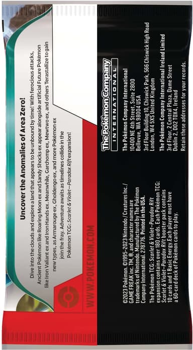 Pokémon Scarlett & Violet Rift boosterpack transporterar dig till en plats där det förflutna och framtiden kolliderar. Roaring Moon står emot artificiella Pokémon från framtiden som Iron Valiant ex. Nya attacker och förmågor väntar dig.Läs mer om produkten