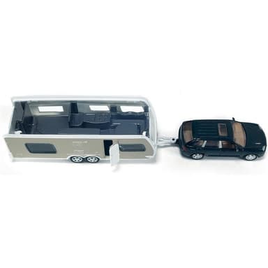 Porsche med Dethleff husvagn med avtagbart tak, figurer, solstolar, solsäng, bord, hammock & grill