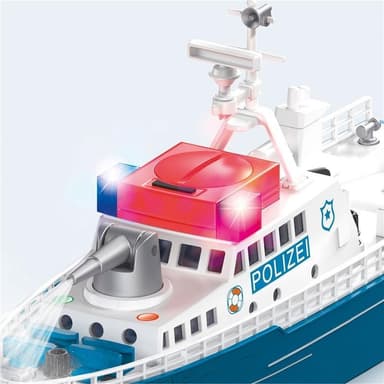 Den flytande polisbåten har belysning och siren och är beväpnad med fungerande vattenkanon