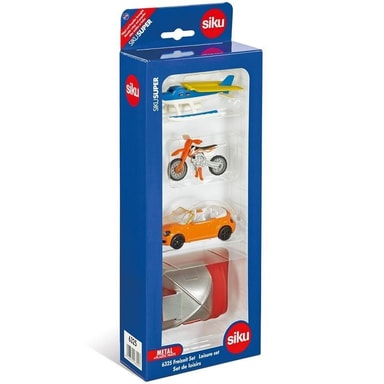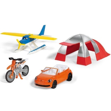 Snyggt presentset med tält, motorcykel, flygplan och fräck bil