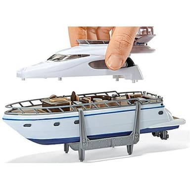 De sju axlarna, med gummidäck, transporterar den lyxiga, båten säkert och stadigt.