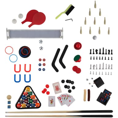 Tack vare det smarta växlingssystemet kan de olika nivåerna enkelt bytas ut efter behag. Varje spel kommer med rätt tillbehör, som bordtennisracketar, fotbollar, biljardkrita eller rengöringsborste.