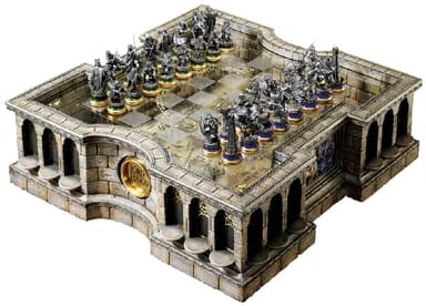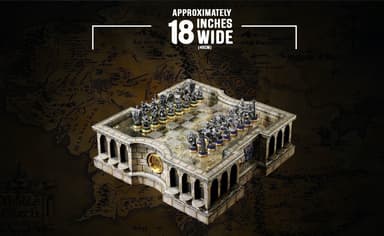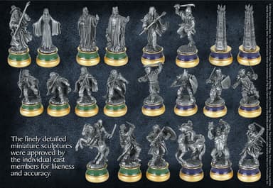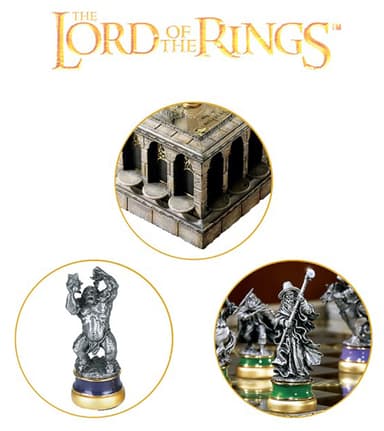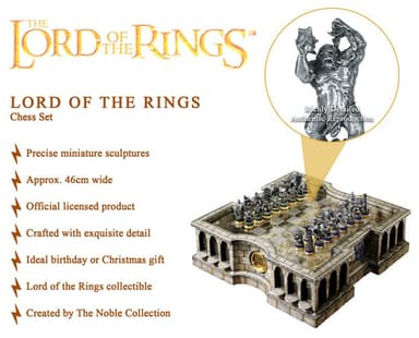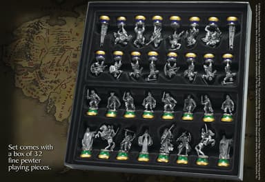 Skaffa detta Noble Collection Lord of the Rings schack och du kommer få filmexakta schackpjäser i metall på en spelbräde i glas med kartan över Middle-Earth synlig under den. Spela ett av de äldsta spelen med stil.Läs mer om produkten