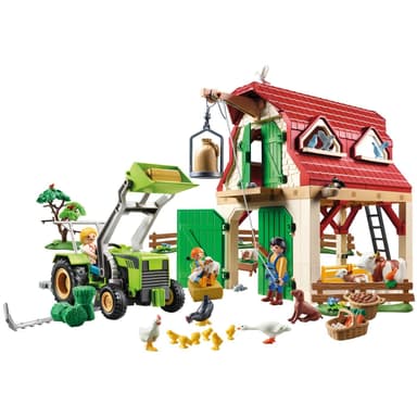 Satsen består av tre PLAYMOBIL-figurer, en bondgård med en godslift, en traktor, en ko med en kalv, gäss, höns, möss och en hund och många fler tillbehör för spännande lek på bondgården