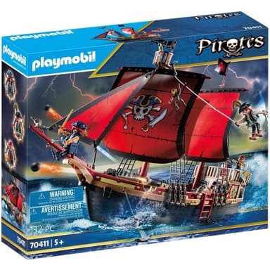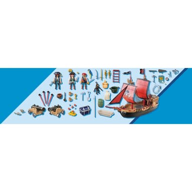 Leksetet innehåller ett piratskepp, tre PLAYMOBIL-figurer, en klätterapa, en papegoja och två råttor.
