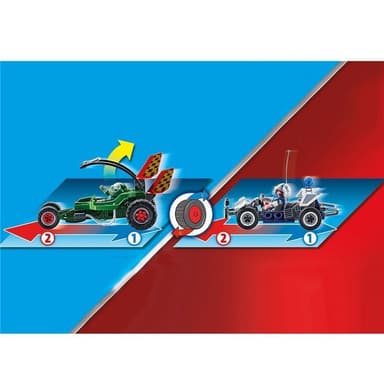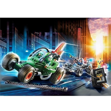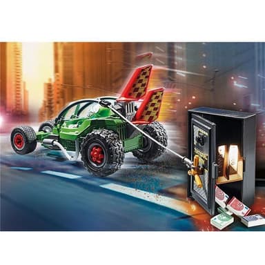 Den här tjuven ryggar inte tillbaka för någonting. För att kunna stjäla kassaskåpet har han bundit fast det vid sin bil med ett rep och helt enkelt ryckt ut det från väggen. Med kassaskåpet i släptåg kör han nu bort genom gatorna. Men den listige tjuven hade inte räknat med de modiga PLAYMOBIL-polisen.