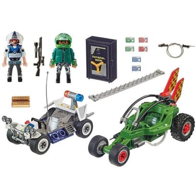 - Leksetet innehåller två PLAYMOBIL-figurer, två bilar med tillbakadragningsmotor, ett kassaskåp, en spikmatta, sedlar och många andra tillbehör