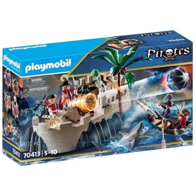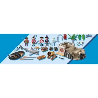 Leksetet innehåller en soldatfästning med stor kanon, fyra PLAYMOBIL-figurer, en roddbåt med en liten, svängbar kanon, en skattkista med skatt och många fler tillbehör