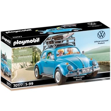 VW Käfer är en äkta klassiker. Nu gör den kultige småbilen med sin omisskänliga form entré i den glada PLAYMOBIL-världen. Naturligtvis har PLAYMOBIL-Käfer alla de karakteristiska kännetecknen som gör den så unik som den böjda kofångaren, VW logot, den vertikala vindrutan, den blå färgen och den typiska bakre motorhuven med den 4-cylindriga boxermotorn. När taket tagits bort kan man se den kärleksfullt gestaltade inredningen med beige säten, armaturbräda och ratt. I baksätet finns det plats för barnet samt kylbox, sandleksaker och en handduk. Koffert och surfbräda till strandutfykten spänns fast på takräcket med två remmar. Nu är det dags att stiga in och ge sig iväg till stranden!
