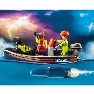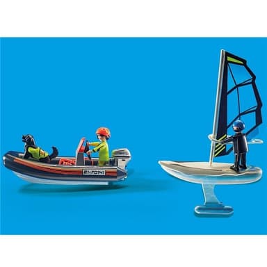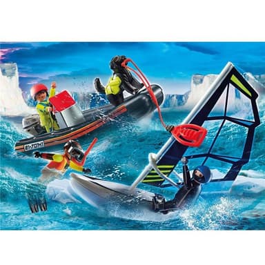 - Uppsättningen innehåller tre PLAYMOBIL-figurer, en hund, en gummibåt, ett polarfartyg, en livboj och många andra tillbehör