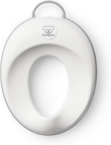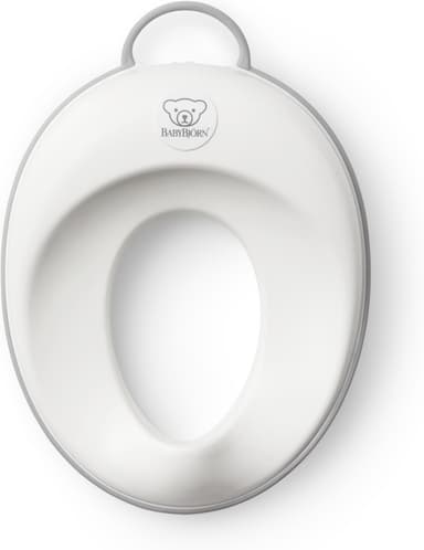 Toalettsitsen BabyBjörn är stabil, säker och bekväm att använda. Barnet kan också sätta den lätta sitsen på plats själv med hjälp av det bekväma bärhandtaget. Gummikanten med en icke-klibbig yta sitter säkert på en normalstor toalettstol.
