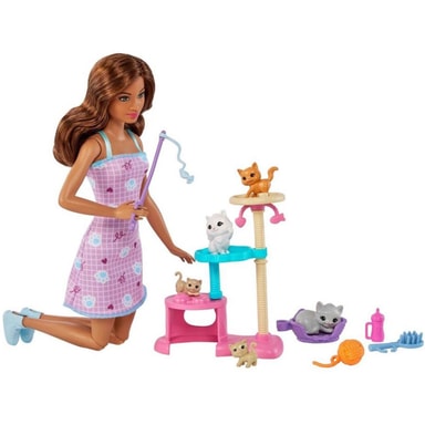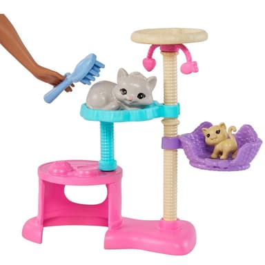 Leksetet Kitty Condo™ har flera nivåer och roliga detaljer som en repleksak, en korg som flyttar huset upp och ner och kattleksaker som är klippta på huset eller i Barbiedockans® hand. Barn kan hjälpa barbie® att ta hand om kattungar med tillbehör som uppmuntrar till rolig lek som en flaska, borste och en garnboll.