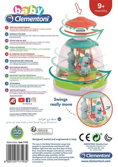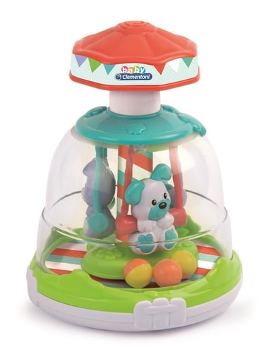 En virvelvind av skoj med en fantastisk djurkarusell! Ett tryck på knappen på den här underbara snurran och djuren på karusellen börjar snurra som på en riktig lekplats och rör på de små bollarna för att roa barnet. En perfekt leksak för att utveckla den manuella förmågan hos de yngsta barnen och förståelsen för lagarna om orsak och verkan.