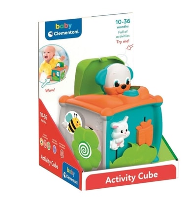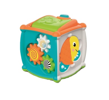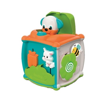 En magisk kub fylld med fantastiska aktiviteter som bara väntar på att upptäckas. Den har 5 olika lekzoner som är utformade för att få barnen att fokusera på en aktivitet i taget och uppmuntra till koncentration. När barnen trycker på en knapp öppnas locket och en hundvalp dyker upp - en effekt som garanterat kommer att få dem att tappa hakan! När blomman är vriden flyger humlan runt den. Kaninen hoppar upp för att få tag i moroten och fisken vänder på en sida för att skapa en tittut-effekt. Kuggarna stimulerar deras manuella färdigheter. Kuben ger sensorisk stimulans, stärker förmågan att förstå orsak och verkan, förbättrar finmotoriken och väcker nyfikenhet.