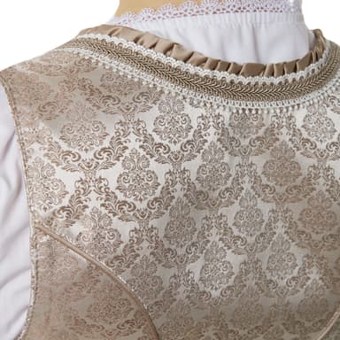 Den mjuka färgkontrasten mellan rosa och beige framstår som elegant, kvinnlig och ändå modern – en kombination som nytolkar klassiska folkdräktselement. Dirndlen kan utmärkt kombineras med ljusa blusar, subtila smycken och pumps eller ballerinaskor i rosé eller kräm.