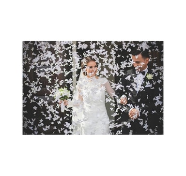 Konfettikanonen använder tryckluft för att mata ut vit pappersfjärilsformad konfetti från kanonen.Läs mer om produkten