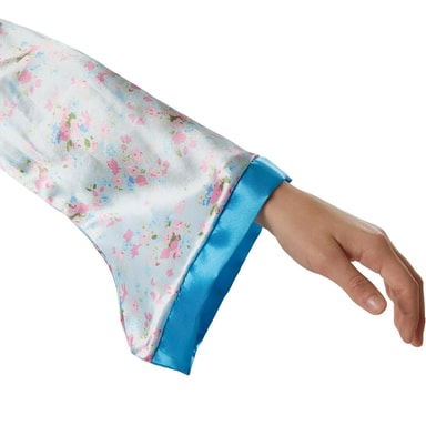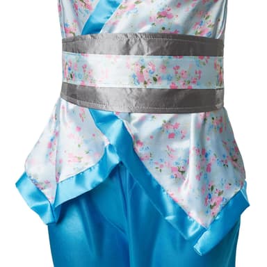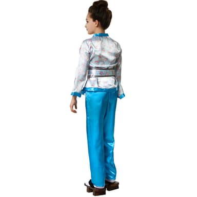 Flickdräkten Förtjusande Yuki består av en överdel, byxor samt ett bälte av satin. Den traditionella omlottöverdelen har ett diskret blommönster och ljusblå fåll. Ärmarna är vida vid ärmsluten och även de pryds av en ljusblå fåll. Det silvergrå bältet har en insats med blommönster och knäpps med kardborreband. De ljusblå byxorna har vida ben och gummiresår, material: 100 % polyester.