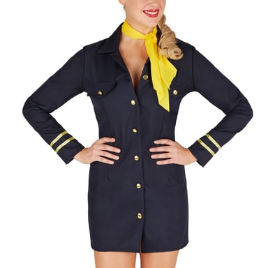 Maskeraddräkten Flygvärdinna för damer, består av en mycket kort klänning, en hatt och en scarf att knyta runt halsen. Material: 100 % polyester.
