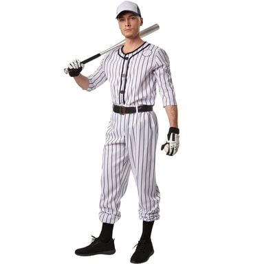 Maskeraddräkten Baseball för herrar består av en randig överdel med påsydd baseball-applikation och stora knappar. Långa och randiga byxor med ett bälte. Baseboll-uniformen avslutas med par svarta strumpor. Material: 100 % polyester.
