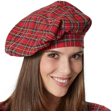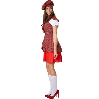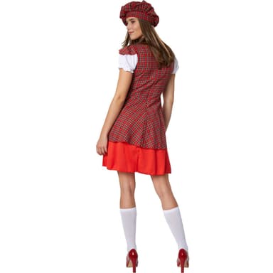 Damdräkten Ung skotsk tjej har ett landstypiskt rutigt mönster. Den matchande enfärgade blusen är insydd med volanger vid de korta ärmarna samt vid bysten. Överdelen har axelklaffar och en antydd korsettsnörning. Kragen samt snörningen är kontrasterande enfärgade. Den rutiga överrocken har en slits framtill och låter den något längre, enfärgade underkjolen skina igenom. För att göra dräkten komplett, medföljer en mössa med rutigt mönster samt enfärgade knästrumpor. Dräkten knäpps i ryggen med dragkedja, material: 100 % polyester.