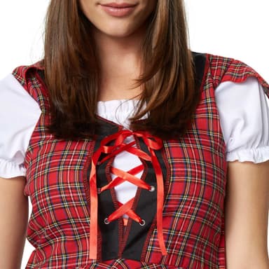 Förtjusa alla Highlands-män som ung skotsk tjej. Med den kortärmade, rutiga överrocken med antydd korsettsnörning, volangblusen samt den knälånga underkjolen kommer du inte att missa ditt mål. En sådan förtrollande syn är inte något som de här tuffa killarna ser varje dag! I denna sexiga outfit som ung skotsk tjej står du i valet och kvalet.
